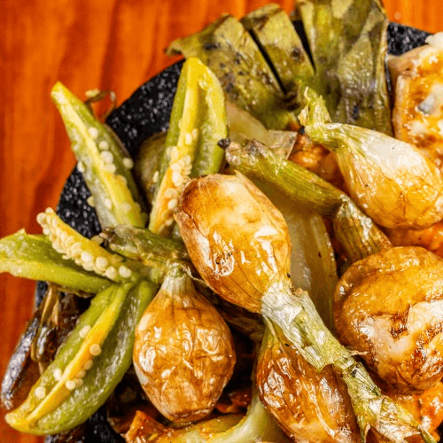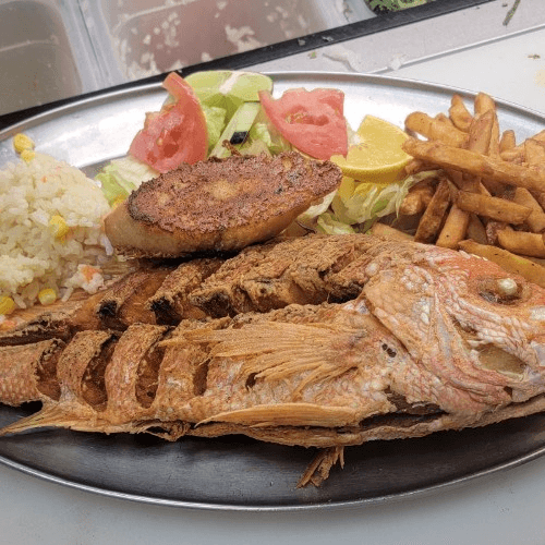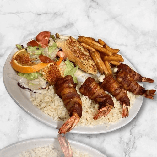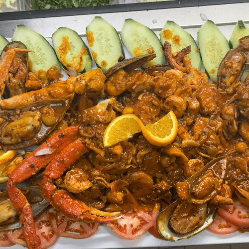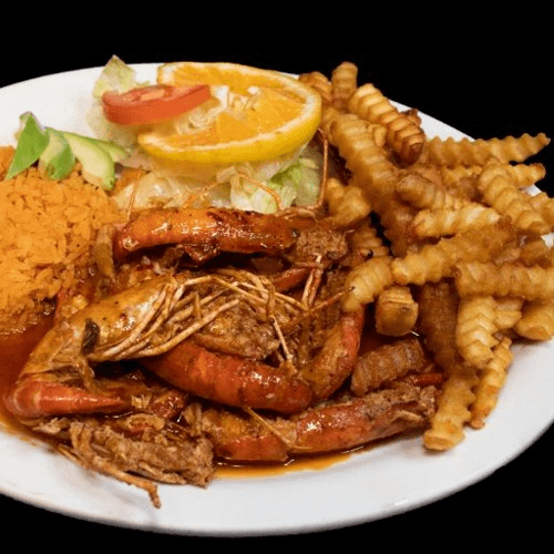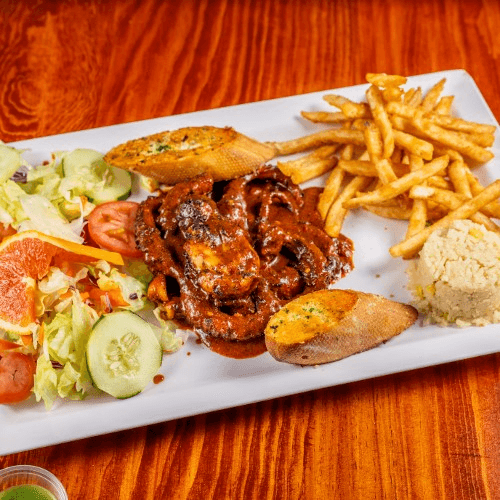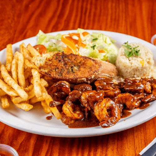 Grilled steak, shrimp in spicy sauce. Served with rice and salad